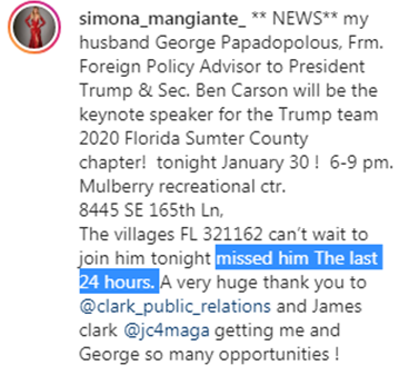 Oh this lil' schemer just made hubby George Papadopoulos fly her out to Florida for his book tour. Gawd only knows what DIRT SHE HAS ON HER HUBBY. She said so before!