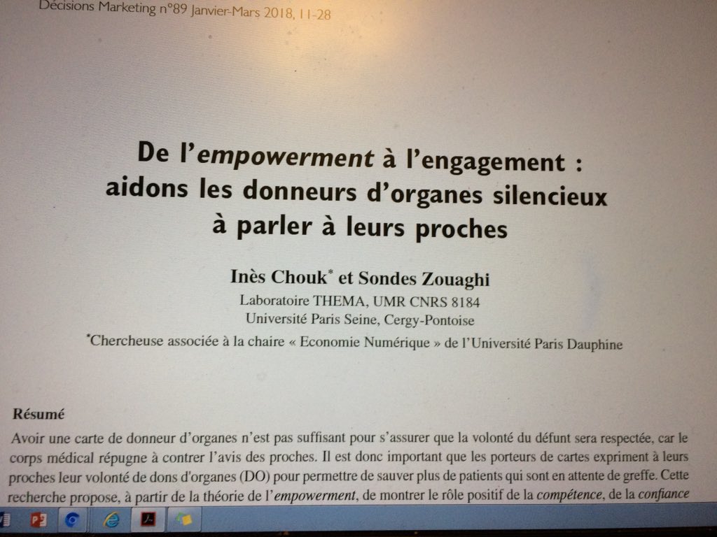 Notre papier (Sondes Zouaghi et moi-même) sur le don d’organe vient d’être publié dans le dernier numéro de Décisions Marketing ( une revue de l’
