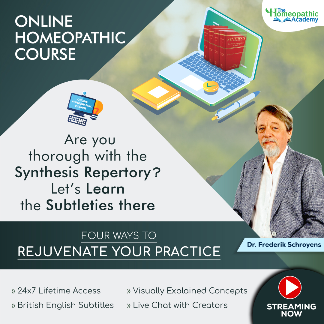 Homeopathy course- Four Ways to Rejuvenate Your Practice by Dr. Frederik Schroyens. He guides you through the latest advancements & additions to the voluminous Synthesis Repertory & elaborates upon the integration of