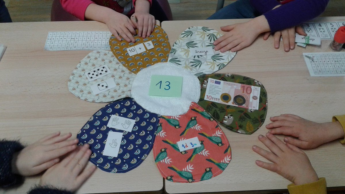 Les CP ont utilisé une fleur des nombres en tissu. Il faut décomposer le nombre qui est au milieu, de plusieurs façons.