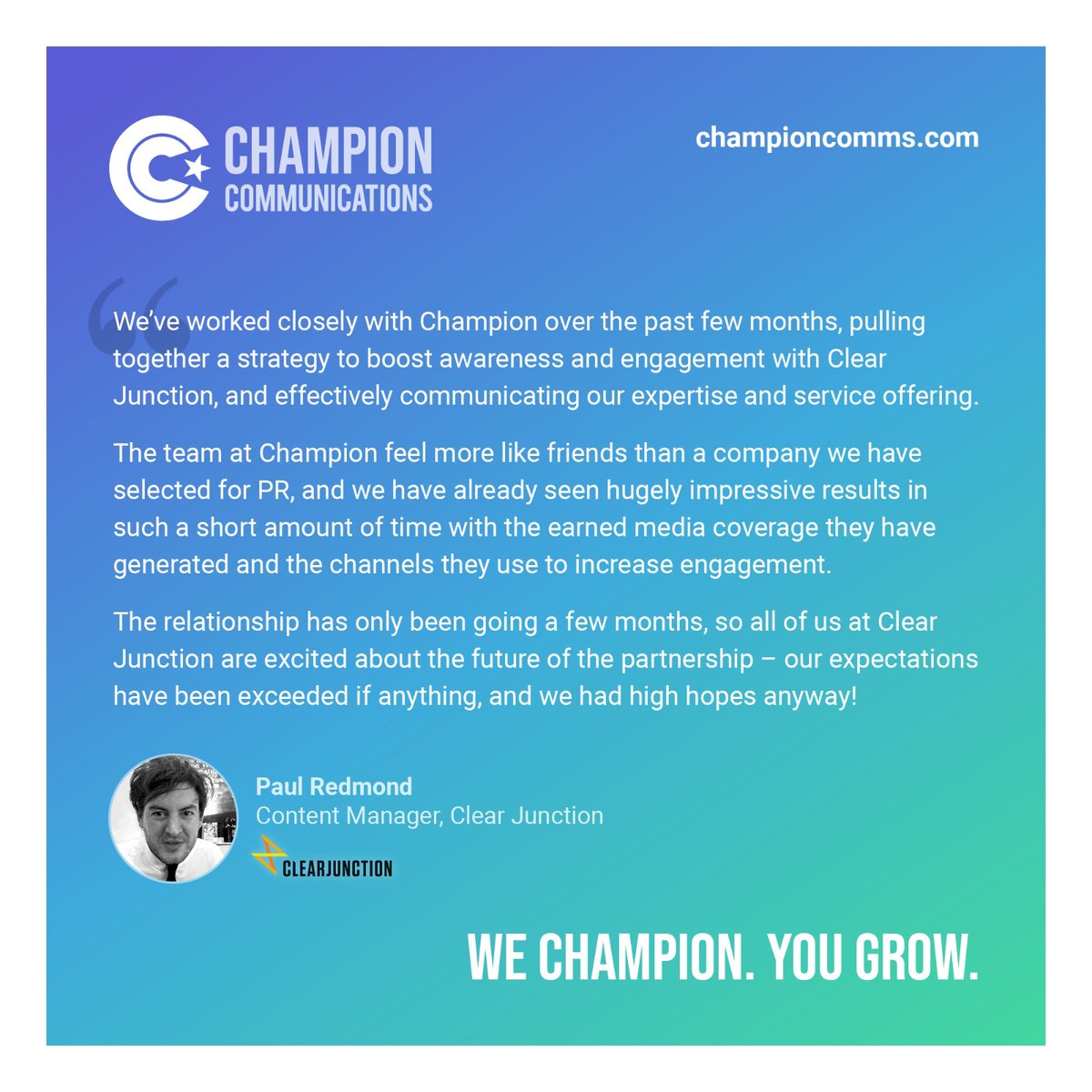 #FeedbackFriday, and Champion client@ClearJunction has shared its delight working with the team over the past few months, and on the results they've seen so far.#B2BPR#mediarelations#techPR#earnedmediapic.twitter.com/22AOmGhFjs