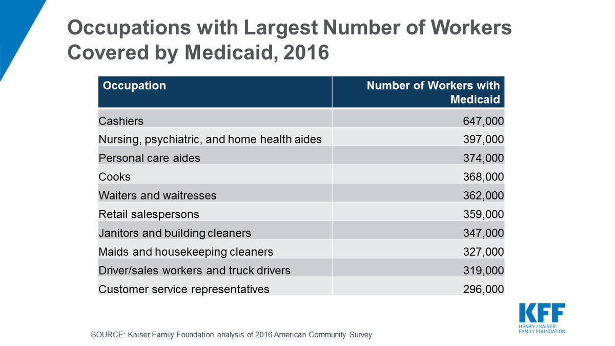 #Medicaid, esp. in expansion states, because they are largely working in low-wage support jobs, such as nursing or personal care aide, cook or waiter/waitress, janitor or housekeeping. https://kaiserf.am/2l2PysC#workrequirementspic.twitter.com/lwZEtihHhK