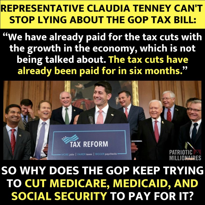 @RepTenney's misleading people when she says the#GOPTaxScam is already paying for itself. It’s not! To help pay for their failed tax scam, the House GOP’s budget cuts#Medicaid,#Medicare &#SocialSecurity making it harder for struggling working families. (h/t@PatrioticMills)pic.twitter.com/vI0yFTprSi