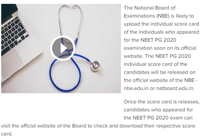 NEET PG 2020 individual scorecard to be available soon at NBE website.