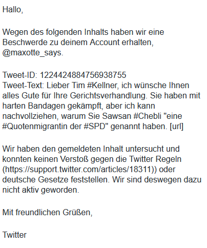 #Twitter#Meinungsfreiheit. Viel Erfolg, Tim#Kellner. Sawsan#Cheblipic.twitter.com/9wJLJMlhSq