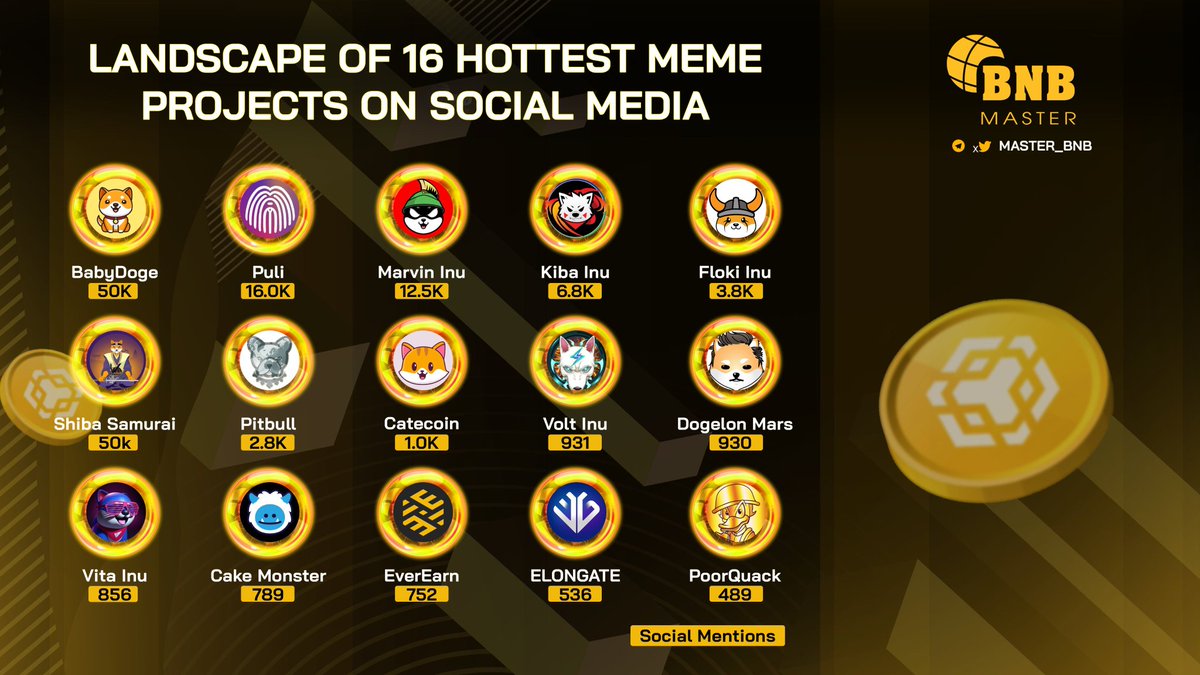 Landscape Of 15 Hottest #Meme Projects On Social Media@BabyDogeCoin@Puli_Token@Marvin_Inu@BscPitbull@KibaInuWorld@RealFlokiInu@shiburai_token@catecoin@DogelonMars@PoorQuack#BNB