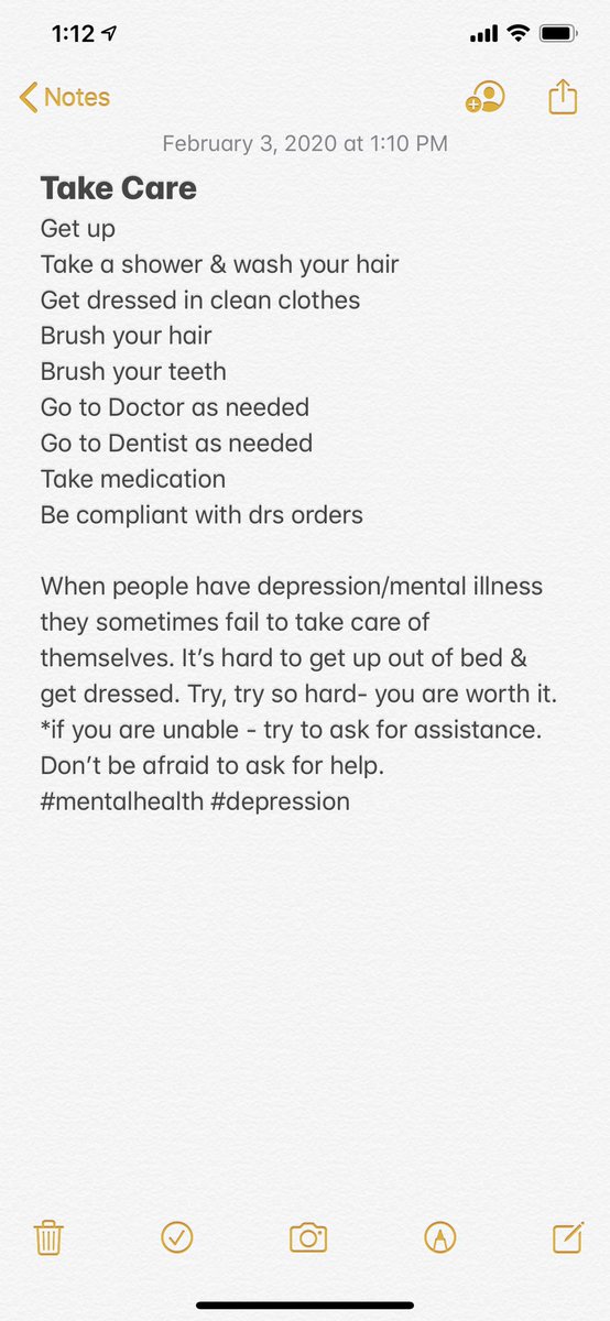Some people may think that it may be silly to share daily activities that all of us do. However, with mental illness, sleeping excessively&daily care is neglected. Be compliant with meds & daily care-you are worth it