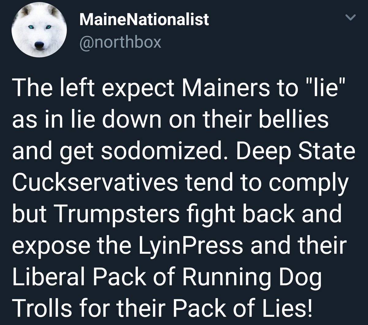 Here is just one of the kooky Tweets. You will notice, as others have today, that sodomy is something this troll account talks a lot about. Excuse me, could we get a comment, Nationalist troll account? If you are in Maine, what part? What's up with the sodomy?