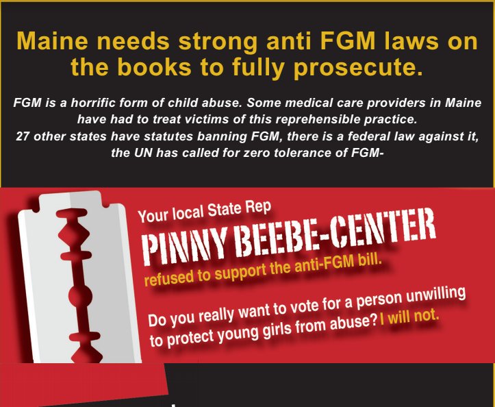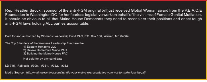 Rep. Paula Sutton's PAC just ran a full-page ad in the Courier-Gazette against Rep. Pinny Beebe-Center for her vote against the FGM bill promoted by Act for America (and using