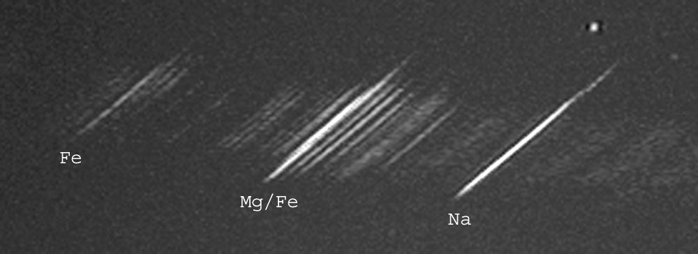 Examining the spectrum closely reveals the distortion of the trail by the mesospheric winds. Note the twist in the blended Mg/Fe line and the kink at the start of the Na line. Na trail was very strong.