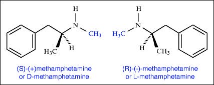 Methamphetamine has a #chiral center and exists as 2#enantiomers (mirror images of one another)