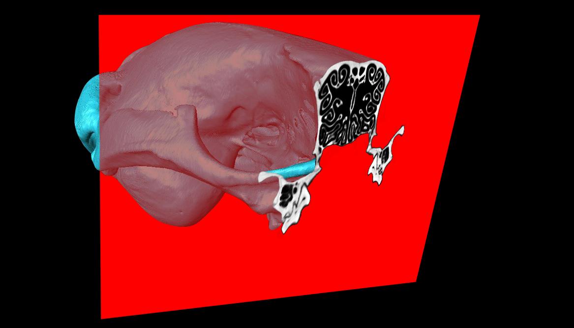 Transverse slice down the left premaxilla of Neovenator. Note the neurovascular canals creeping laterally to the tooth sockets (top of the GIF).