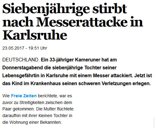 #Karlsruhe ersticht ein#Migrant (Kamerun) ein 7jähriges Mädchen. Medien berichten einheitlich nur von einem "Mann". Mir wird übel. pic.twitter.com/v9ypRJpRBa