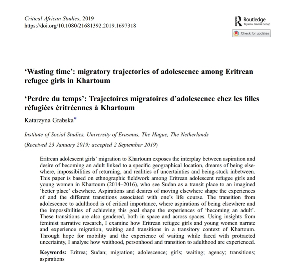 @CrASJournal article, now online: ‘Wasting time’:#migratory trajectories of adolescence among#Eritrean#refugee girls in Khartoum' by Katarzyna Grabska of@erasmusuni: https://tandfonline.com/doi/full/10.1080/21681392.2019.1697318 …@HazelSophiaGray@sj_ck@rikesitas@africanstudies@UCT_news@Rout_PoliticsIRpic.twitter.com/fPFe1uSGeM