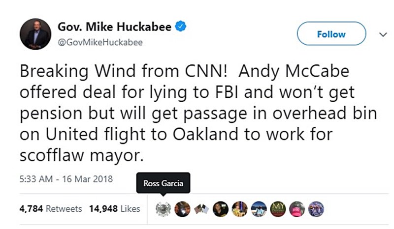 Mike Huckabee Celebrates Firing Of Former FBI Deputy Director By Making Dead Dog Joke? HA HA HA Mike's son Killed a dog just to watch it die ! HA HA HA