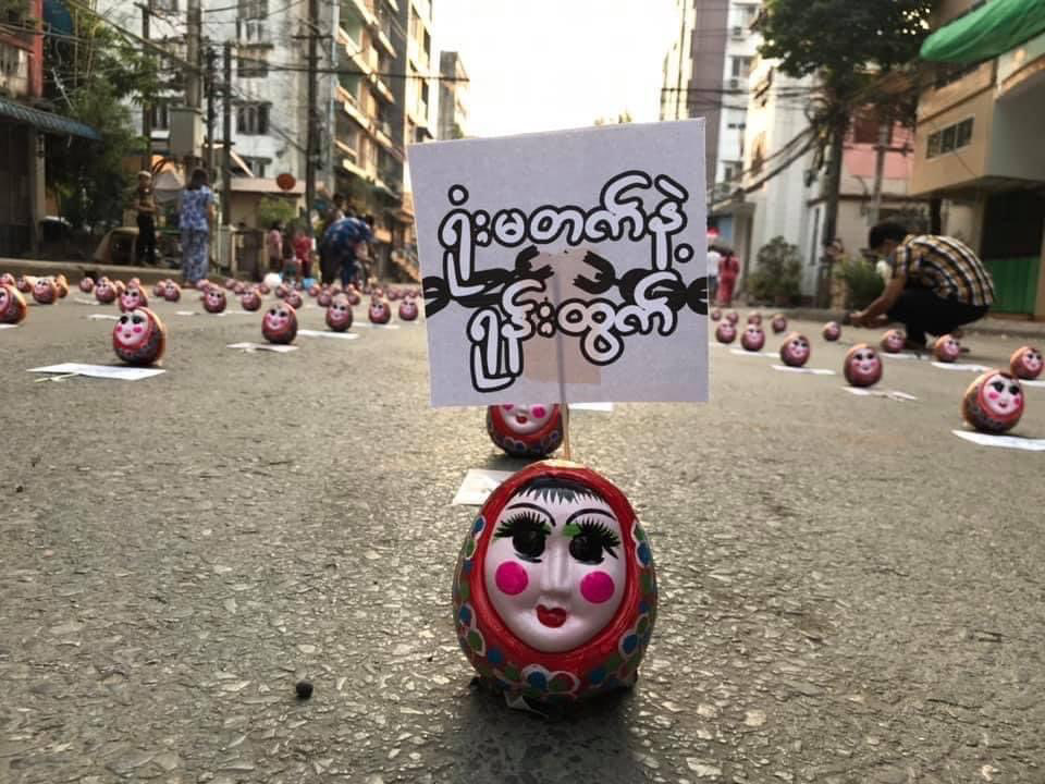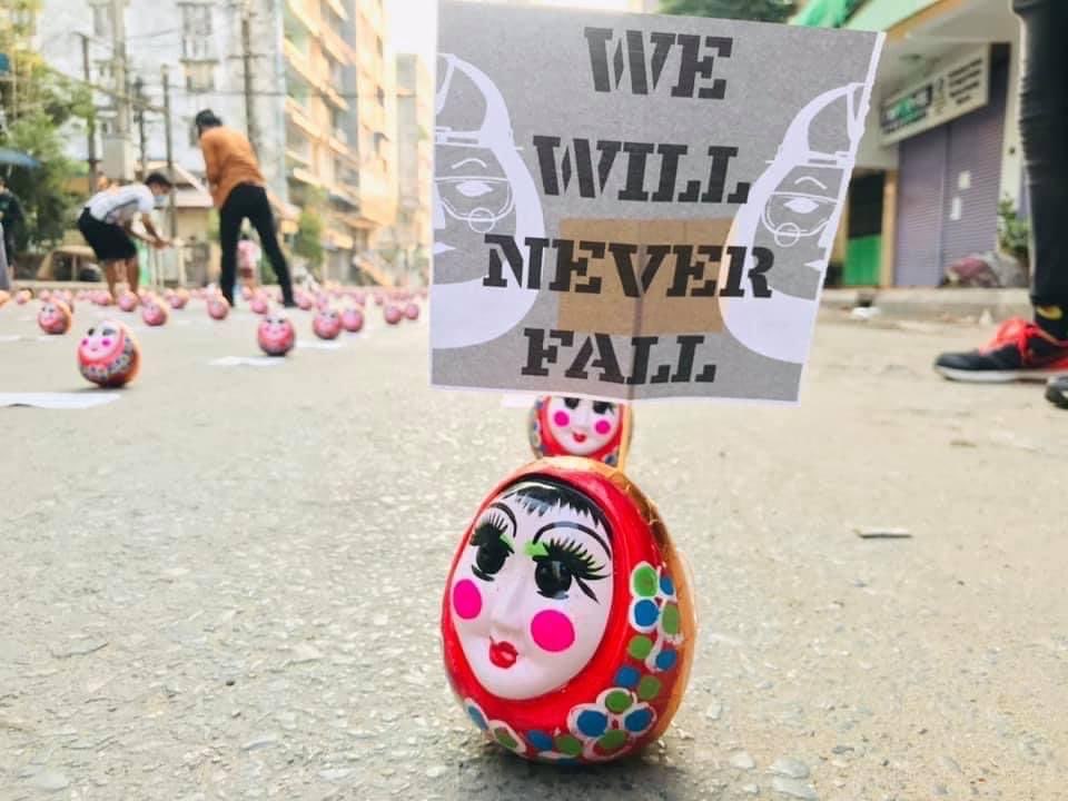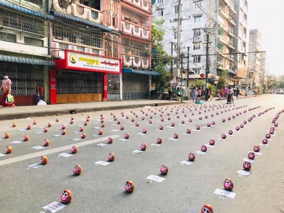 #Yangon neighbourhood, residents have laid out these traditional#Myanmar toys called 'Pyit Taing Htaung'. Literally translated as "when you throw it, it stands up each time". This is citizens' way of countering#military violence they've experienced#WhatsHappeningInMyanmarpic.twitter.com/8mvaoyCRdC