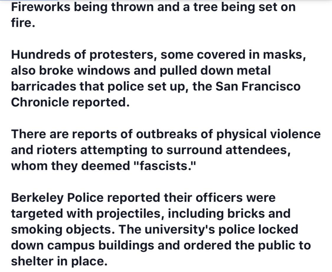 #MiloProtest in#Berkeley was self defense. Not happy about innocent ppl hurt; casualty of war.pic.twitter.com/7cxWcgViwh