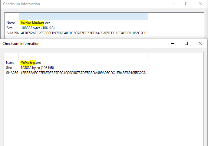 Created a copy of the MsMpEng.exe (Windows Defender Antimalware Service), renamed it to 'Invoke-Mimikatz', and Windows Defender is now a "Trojan". Defender doesn't like seeing Invoke-Mimikatz in a command line. Even the signed Defender executable isn't safe. Beware the