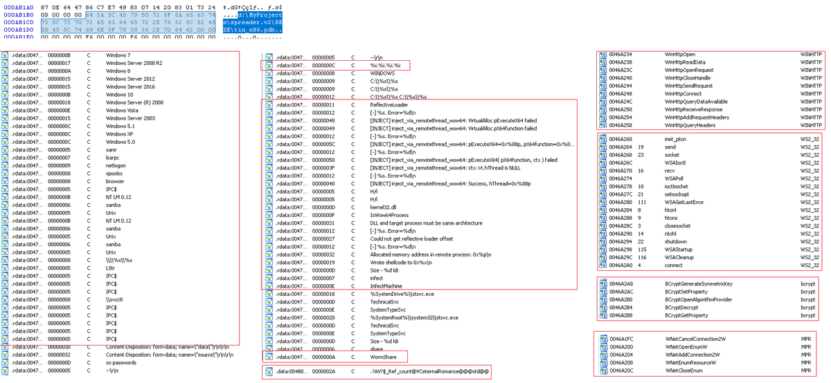 #trickbot#wormshare spreader module v2#mimikatz#eternalromance *Unpacked: https://app.any.run/tasks/c3ad47e5-1af3-4f83-b012-c787eff61f30 … *Pdb: d:\MyProjects\spreader.v2\REXE\tin_x86.pdb *From sample: https://app.any.run/tasks/9fa6e06c-8b79-4966-b861-d44e1e131ad2 … (https://urlhaus.abuse.ch/url/226178/ ) *Refs: -https://www.vkremez.com/2017/09/lets-learn-reversing-trickbot-banking.html … -http://plok1.blogspot.com/2018/02/a-new-spreader-with-mimikatz.html …pic.twitter.com/EtLlnXchb8