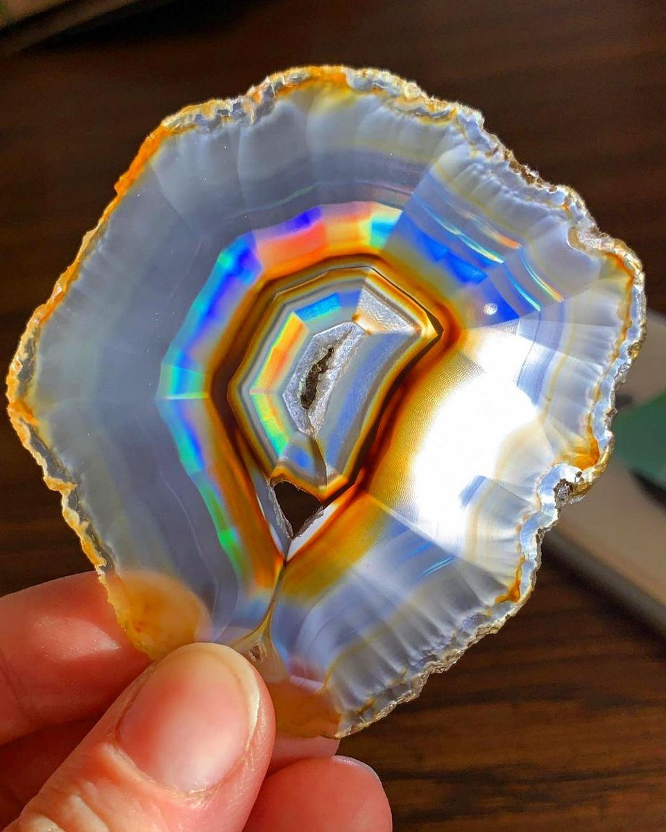 Natural rainbow Iris agate Iris Agate is a unique type of thinly sliced Agate that exhibits a rainbow effect when held up to the sun or a light Photo: http://psychedelic.rocks