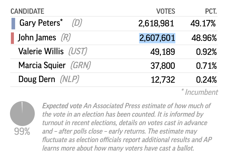#MISEN Gary Peters up 49.13-49.02; margin of 5,664 VOTES. https://elections.ap.org/dailykos/results/2020-11-03/state/MI/race/S/raceid/24463 … -