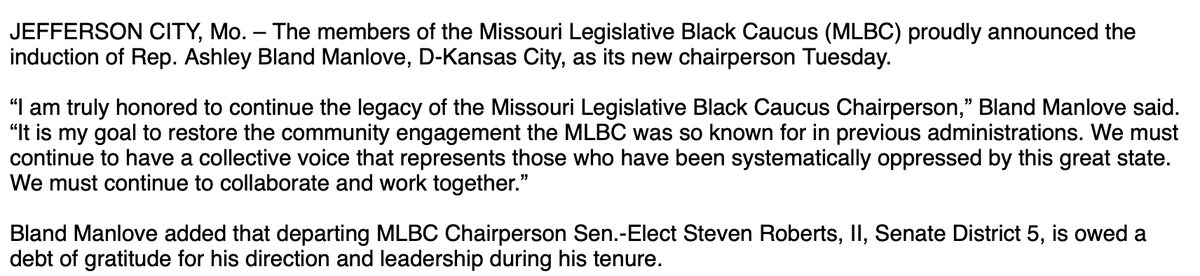 INBOX: Rep. Ashley Bland Manlove is the new chairperson of the Missouri Legislative Black Caucus.
