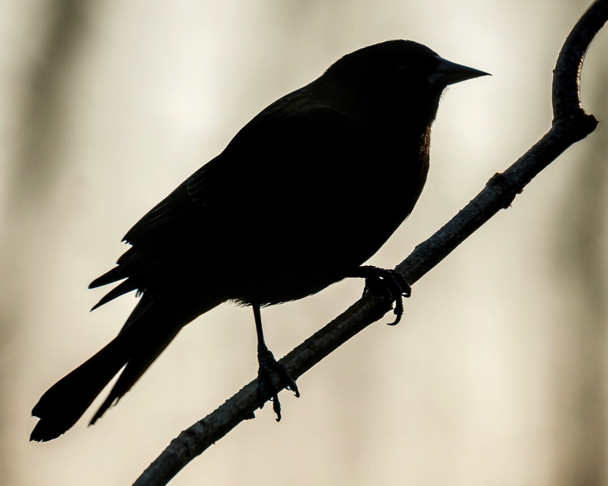 “Early Morning Silhouette” The red-winged blackbird is a black songbird with distinctive red and yellow shoulder patches. It lives in wetlands, marshes and open farm fields.