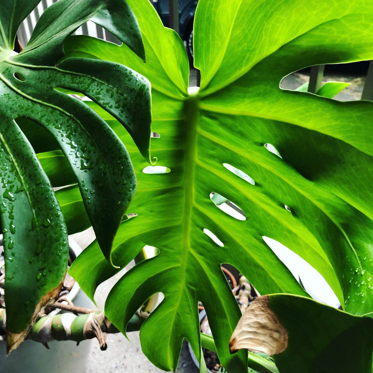 知人宅のモンステラが立派に育ってる!切れ込み、穴だけじゃなく、葉の先が見事に割れてますね。