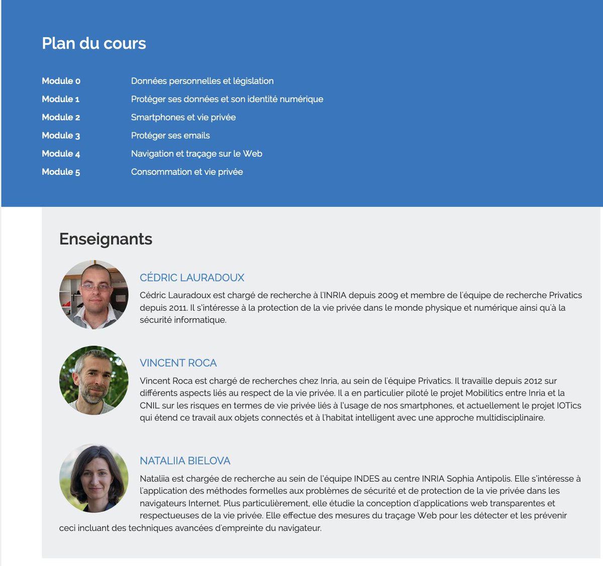 #MOOC "Protection de la vie privée dans le monde#numérique"#moocvieprivee du@InriaLearnLab sur@FunMooc réalisé par@inria_grenoble@PrivaticsInria@nataliabielova https://bit.ly/2wzu1he https://twitter.com/CNIL/status/1065959278723440640 …