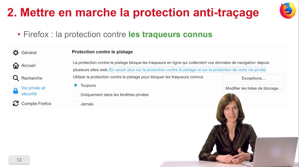 Module 0 : Données personnelles et législation Module 1 : Protéger ses données et son identité numérique Module 2 : Smartphones et vie privée Module 3 : Protéger ses emails Module 4 : Navigation et traçage sur le Web Module 5 : Vie privée et consommation