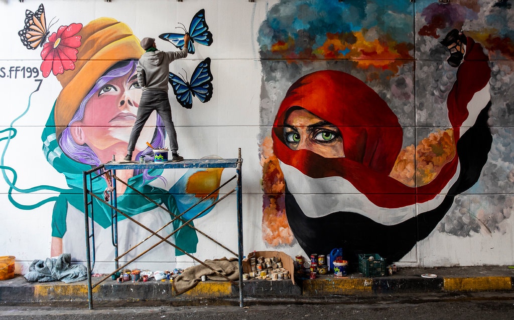 #Beauty had no place in#Iraq for a long time, but#art flourishes once again in the country although amid#protests as the capital is flooded with political art, writes#AlissaJRubin for#NYT . This picture by#IvorPrickett sums up the story in an instant.#moreinless#bitiweetpic.twitter.com/kn3VzZYTMo