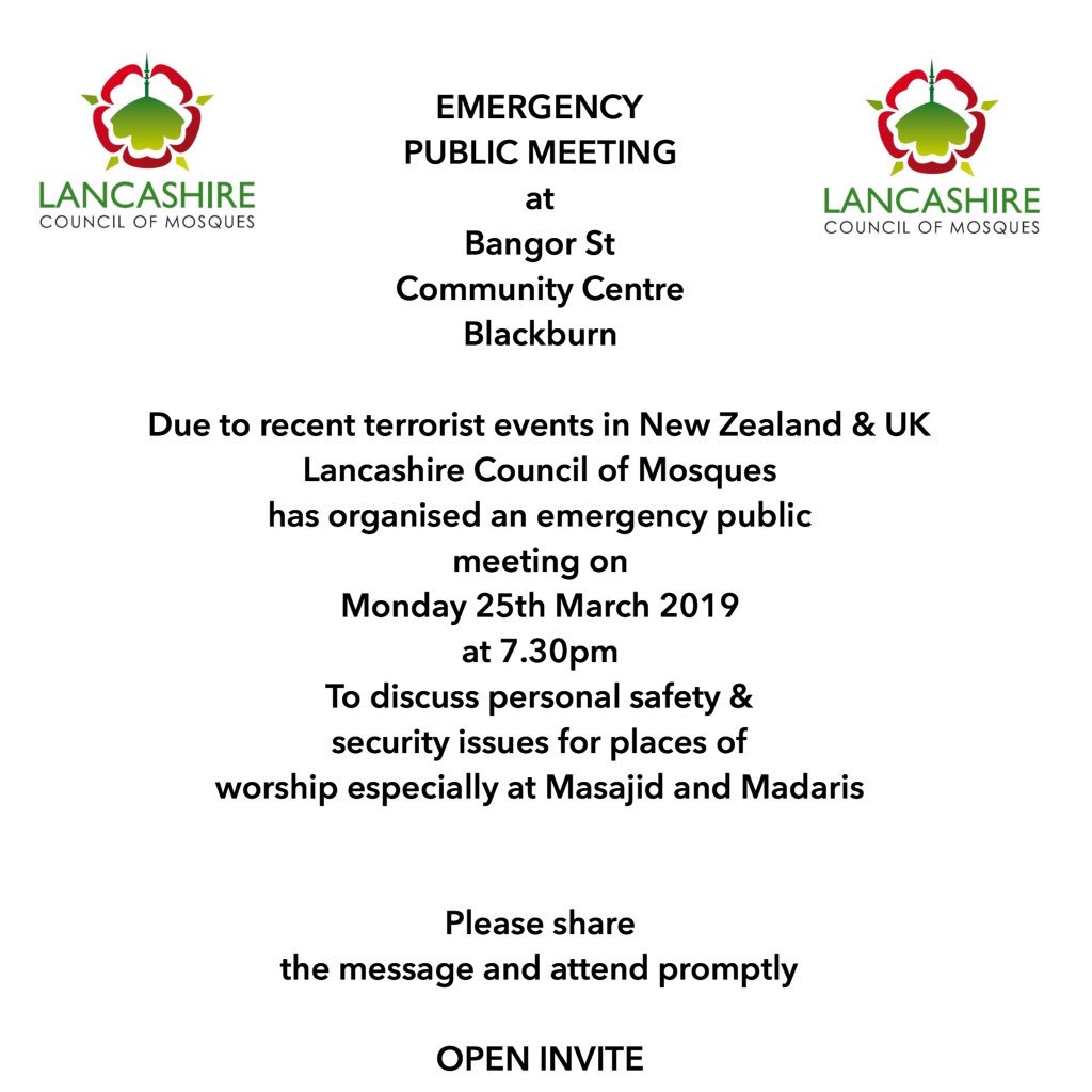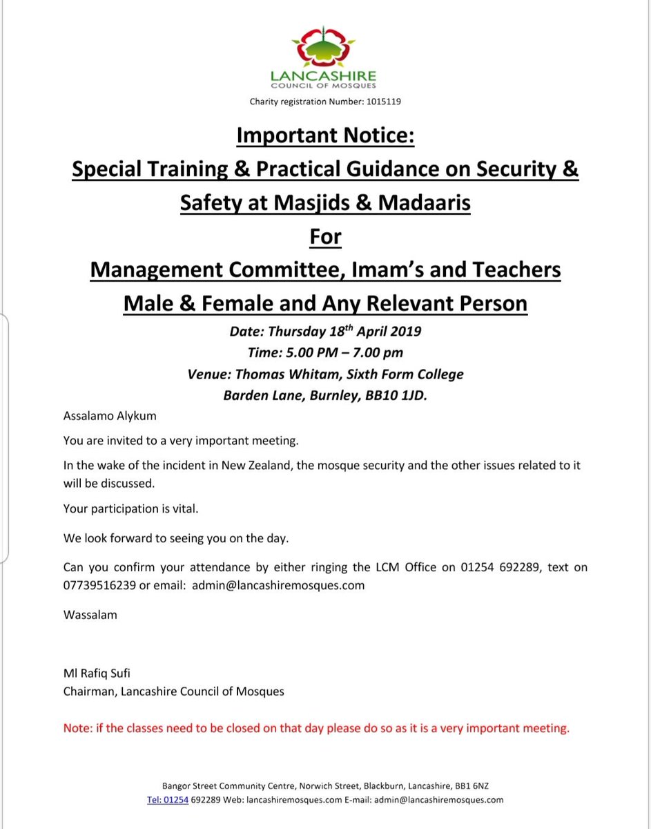 #mosquesecurity workshop for#Burnley#Nelson#Colne#Brierfield everyone invited but please reserve your place with our office at LCMhttps://twitter.com/afrasiab_anwar/status/1114611502743531523 …