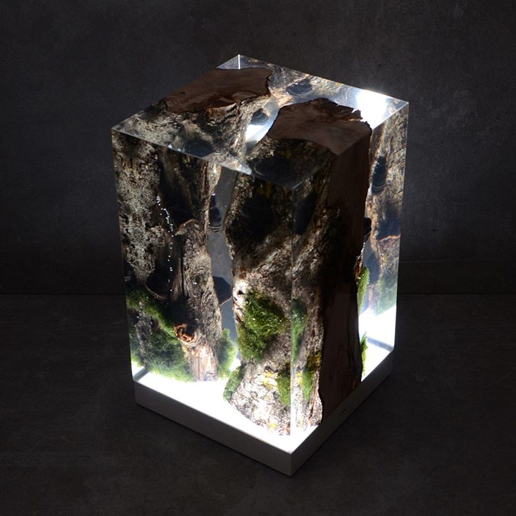 Moss Lamp preserving the natural edges of the wood with their native populations of mosses. http://aarenintpro.com/products/surfaces …
