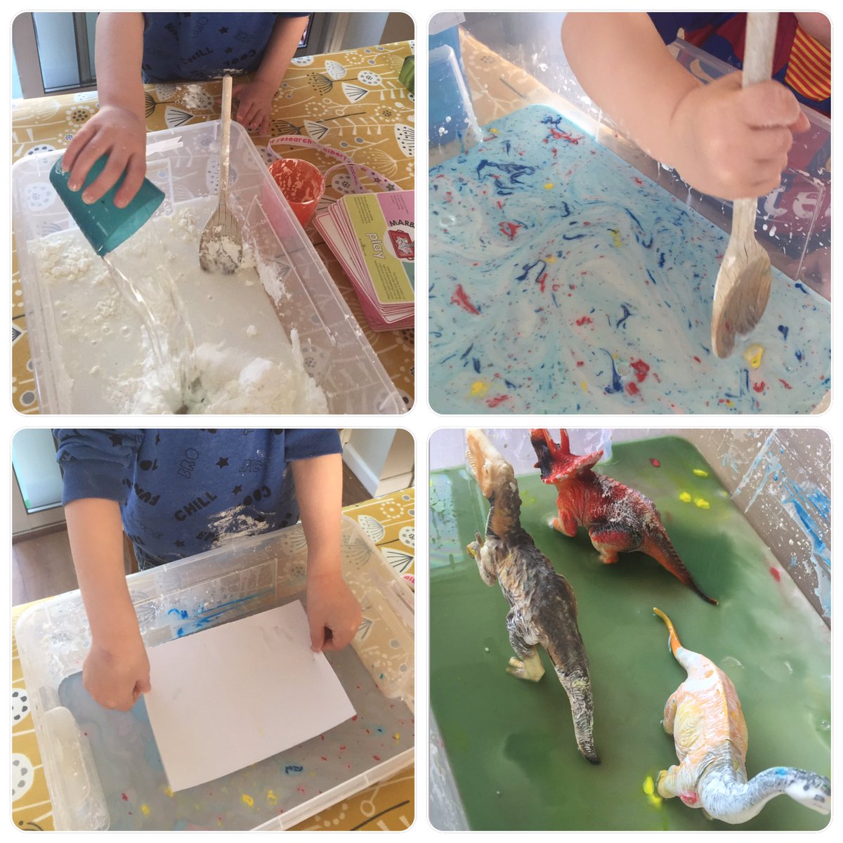It’s been an oobleck kind of day here. Lots of fun making the oobleck, adding colours to create a marbled effect, making prints and of course the best part -getting the dinosaurs involved!