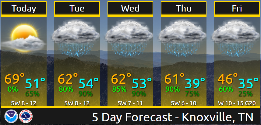 Today will be partly sunny and warm, with high temperatures around 70 across the TN Valley. Rain moves in on Tuesday, with periods of rain continuing into Friday.