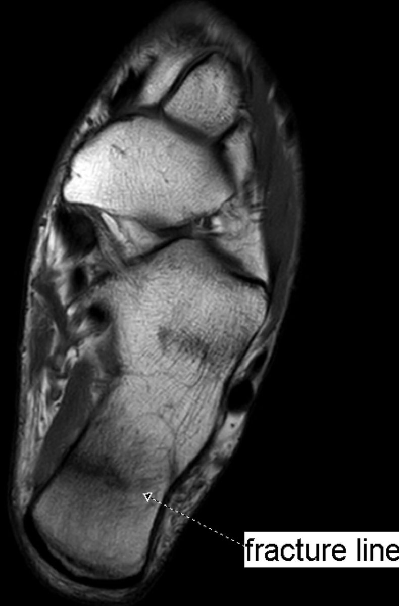 Pain worsening after rest. New MRI 18 days after to rule out again stress fracture, now clearly seen. Back to baseline examination, the oblique fracture plane was better seen as a subtle line in sagittal images.
