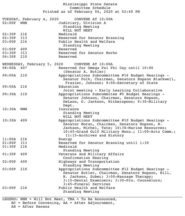 #msleg Senate committee schedule was updated on February 04, 2020 at 02:40 PM pic.twitter.com/XZGBETD9wY