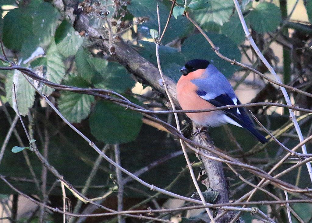 Fluffed up against the cold wind, male Bullfinch. Great colour