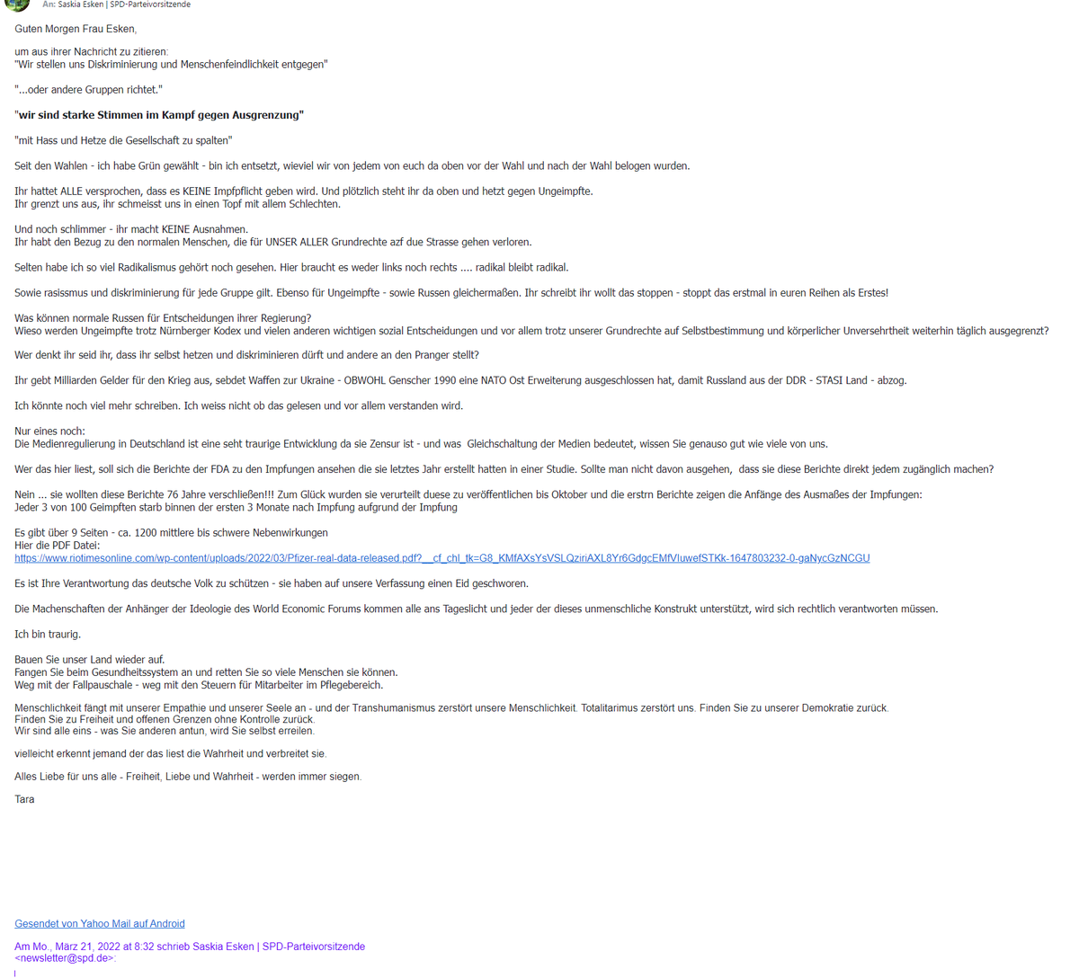 @EskenSaskia 21.03.2022 - Antwort auf Ihren Newsletter Link zu dem FDA Bericht über die Nebenwirkungen zur Impfung: https://www.riotimesonline.com/wp-content/uploads/2022/03/Pfizer-real-data-released.pdf?__cf_chl_tk=G8_KMfAXsYsVSLQziriAXL8Yr6GdgcEMfVIuwefSTKk-1647803232-0-gaNycGzNCGU … Wahrheiten#SPD#Nebenwirkungen#Grundrechte#Demokratie#GegenDiskrimminierung#KeineImpflicht#Freiheit#RESPEKT pic.twitter.com/3Ruzyi19kb