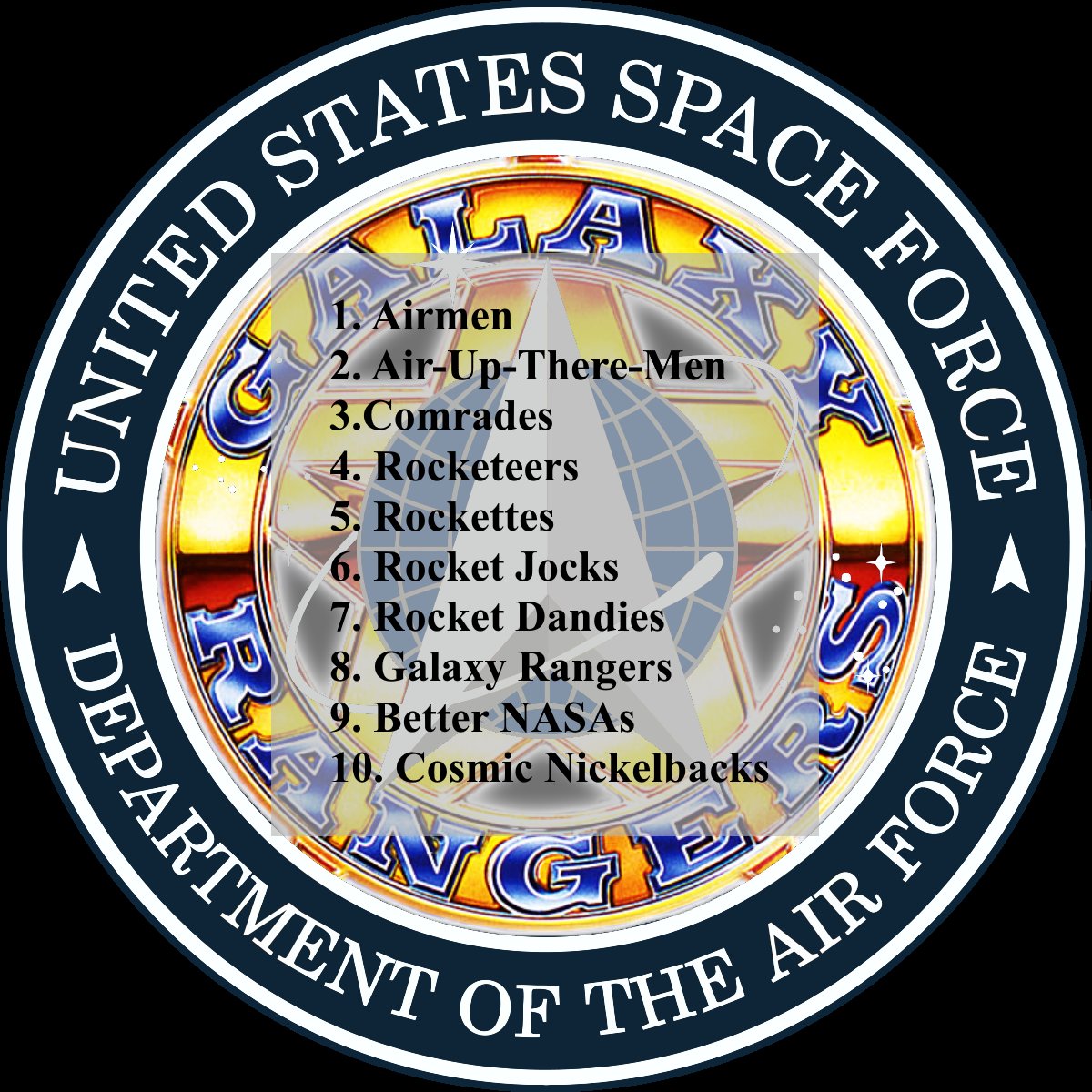 #Nerds. The@PFPAOfficial is crowdsourcing names for US#SpaceForce members. Here are the top 10 submissions: 1. Airmen 2. Air-Up-There-Men 3. Comrades 4. Rocketeers 5. Rockettes 6. Rocket Jocks 7. Rocket Dandies 8. Galaxy Rangers 9. Better@NASAs 10 Cosmic Nickelbackspic.twitter.com/jxwaaNIBx4