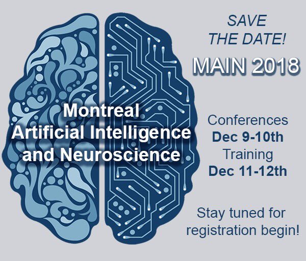 Psssst! Pre-announcing this year’s Montreal AI & Neuroscience meeting (MAIN 2018) Dec 9-10th, right after NIPS. Training workshops on Dec 11-12th. Stay tuned not to miss registration begin. Save the date!