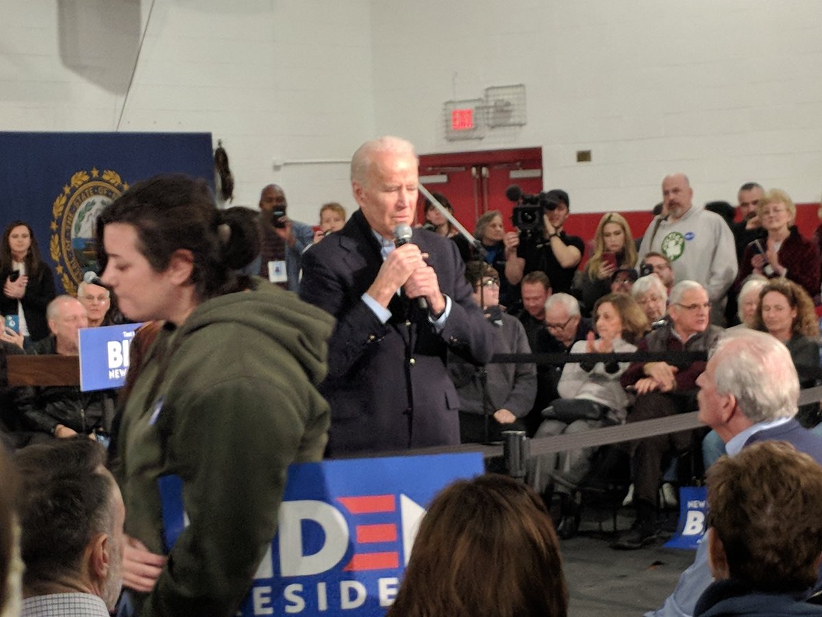 @joebiden. "Joe, how can you talk about character?" Supporters shout him down, "We want Joe."#nhpolitics pic.twitter.com/XsD7ouhlgY