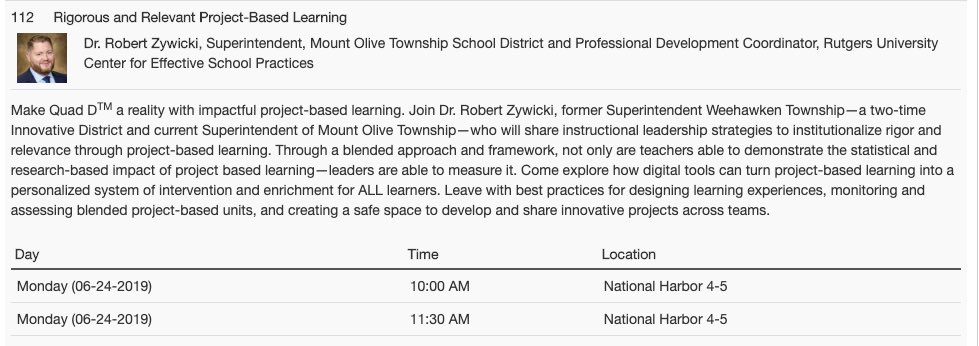 #MSC2019? Go to@ZywickiR’s sessions today to learn how to make Quad D a reality via#PBL.@RigorRelevance#ModelSchools#ActForImpact#NJED pic.twitter.com/okp2L3rbKe
