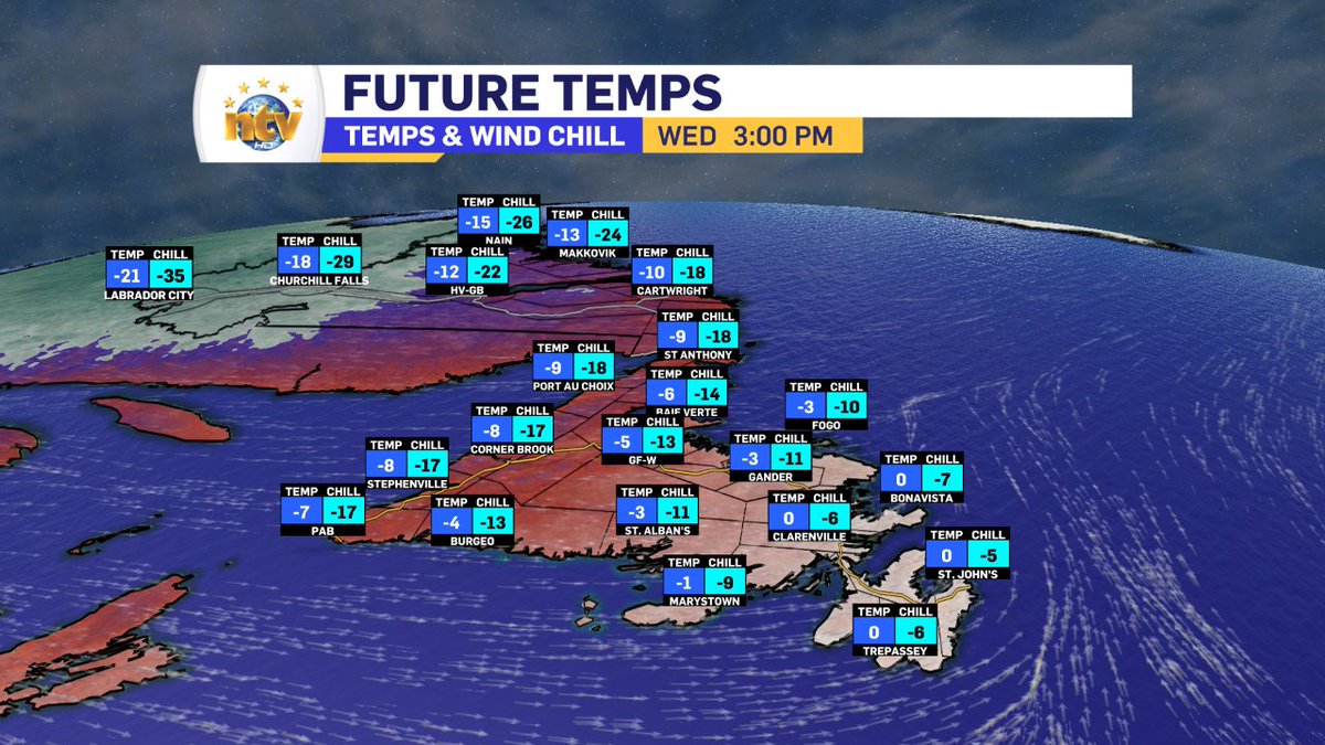 Colder air moves in during the day tomorrow, which leads to falling temps for many areas of Newfoundland during the afternoon hours.