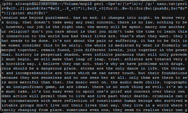 #NNNGM https://nickm.com/post/2019/11/nano-nanogenmo-or-nnngm/ …, 120 bytes of Perl, 168 bytes full. perl -0pe's/(\r*\n)+/ /g;' nano.txt|perl -040e'@w=<>;@r=@w[0..2];push@{$s{"@w[$_..$_+2]"}},$w[$_+3]for(0..@w-3);for(@w){push@r,$s{"@r"}[rand@{$s{"@r"}}];print shift@r}' [1/2]pic.twitter.com/abK6fbE09P