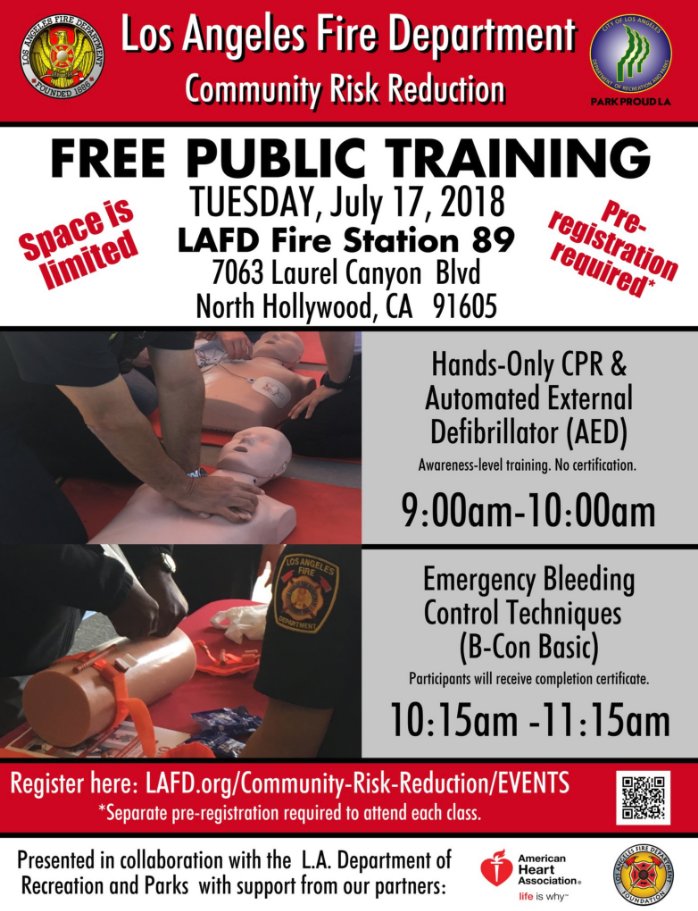 #LAFD in#NorthHollywood on 7/17 to learn the life-saving skills of#HandsOnlyCPR,#AED use and how to#StopTheBleed. The classes are FREE and rotate across@LACity on a monthly basis. For more info & to register, visit: https://www.lafd.org/about/community-relations/community-risk-reduction …pic.twitter.com/G4LUDFUAYl