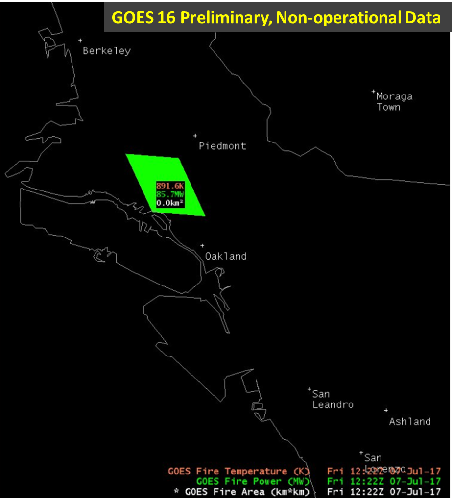 #Oakland hot enough to be detected on#GOES16 satellite. Estimated temp almost 900K#cawxpic.twitter.com/DgnWqeWAFD