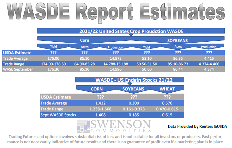 USDA supply and demand (WASDE) report due out tomorrow at 11am CST. Here are the average analyst estimates.
