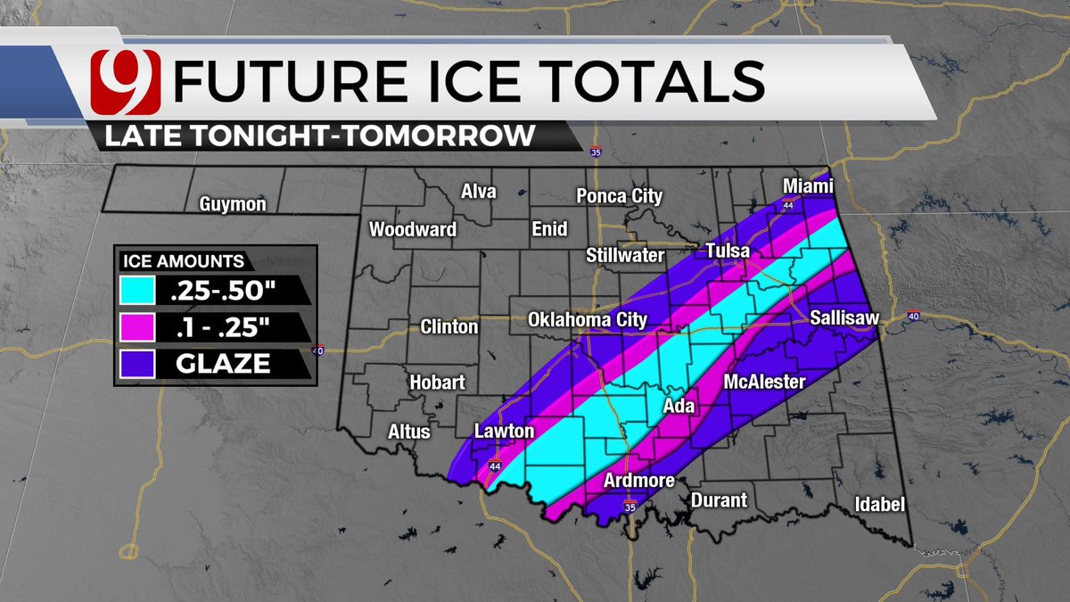 Here's a look at totals for snow, sleet, and ice. Highest ice and sleet totals still appear to stay southeast of OKC. Highest snow totals will also be southeast of OKC. A swath of 2-4" snow totals likely in OKC.