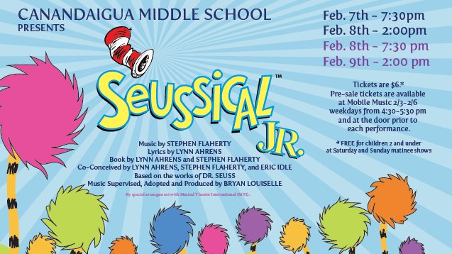 @cms_braves presentation of Seussical, Jr. Dinner & a Show- 7th/8th Grade Spaghetti Dinner Friday, February 7th- 5 p.m. - 7 p.m. CMS Cafeteria See Comments
